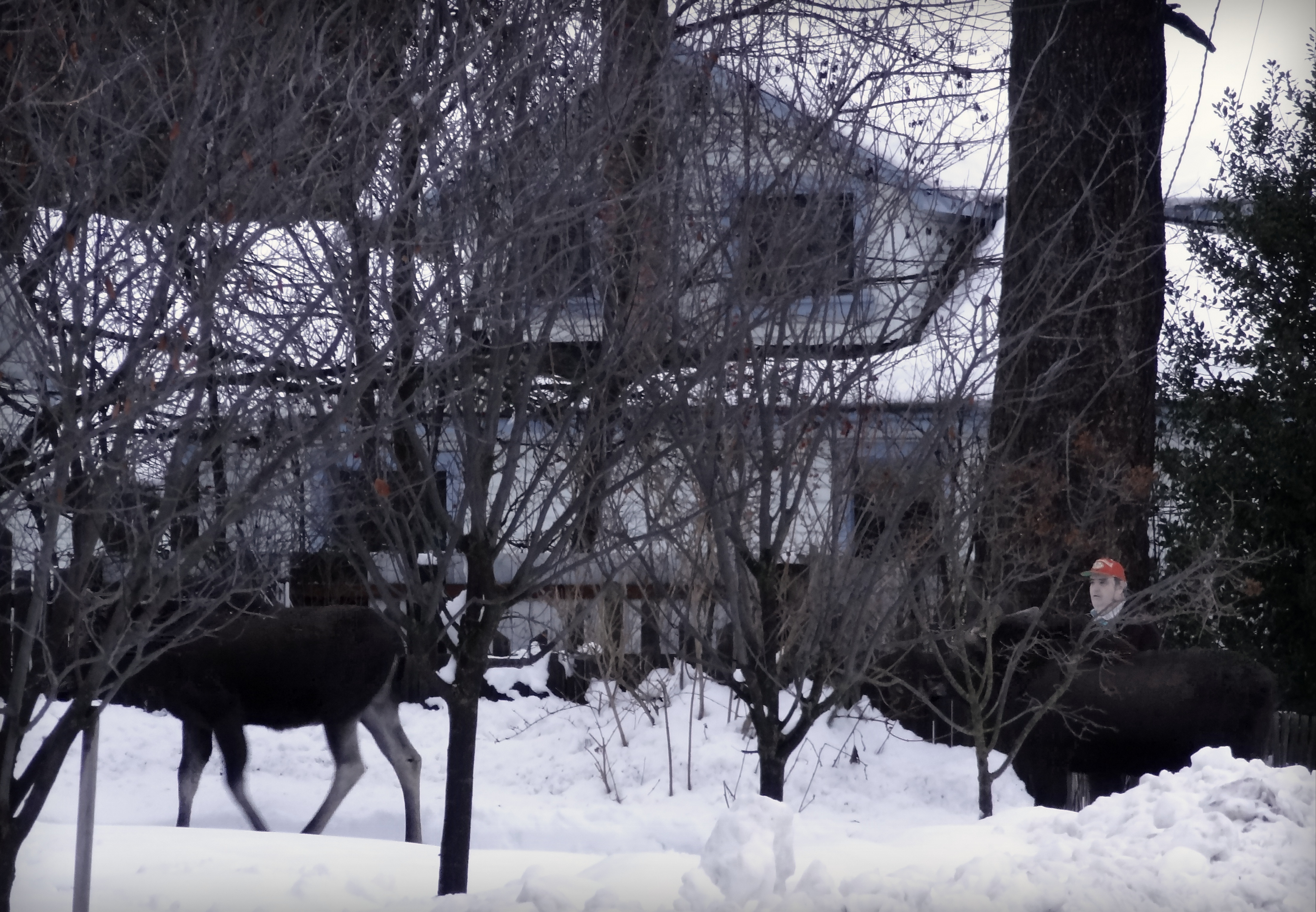 On my way back (it’s dark by now) I see one of the young at the last minute and freeze. I don’t see the mother so I’m a little concerned. Naively I look at the piles of snow and consider if throwing ice balls would make a strong moose defence?
